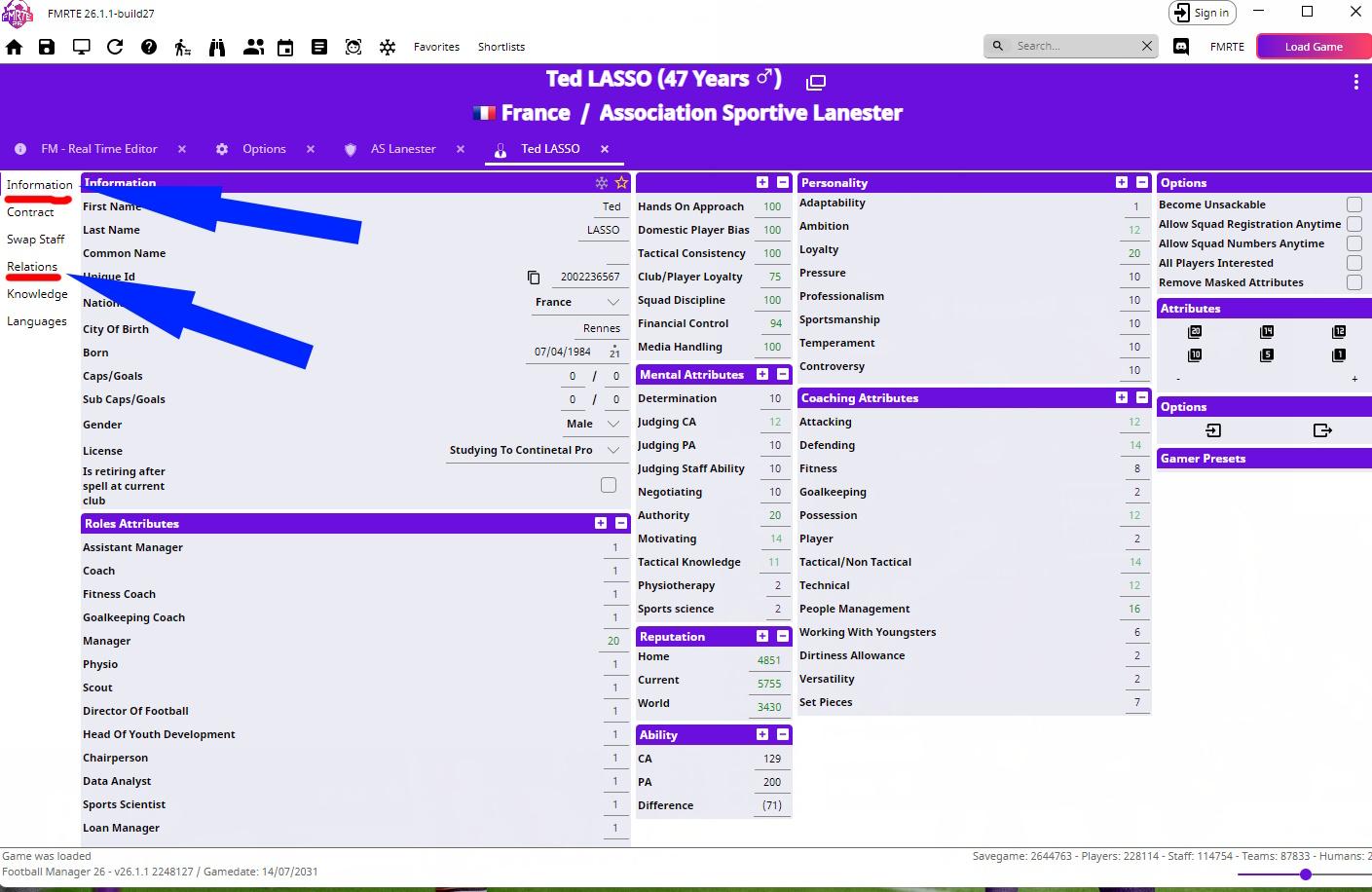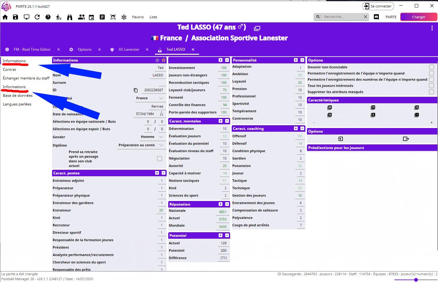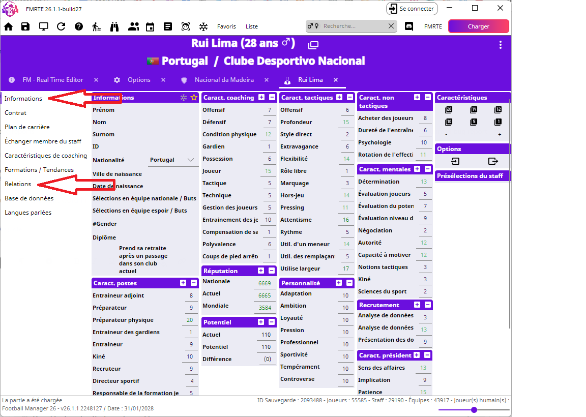 French translation problem : in coach or trainer or player description there is twice menu with the same label content : "Informations". In English these two menus are labelled "Information" and "Relations" which is the good way to identify the content of these menus