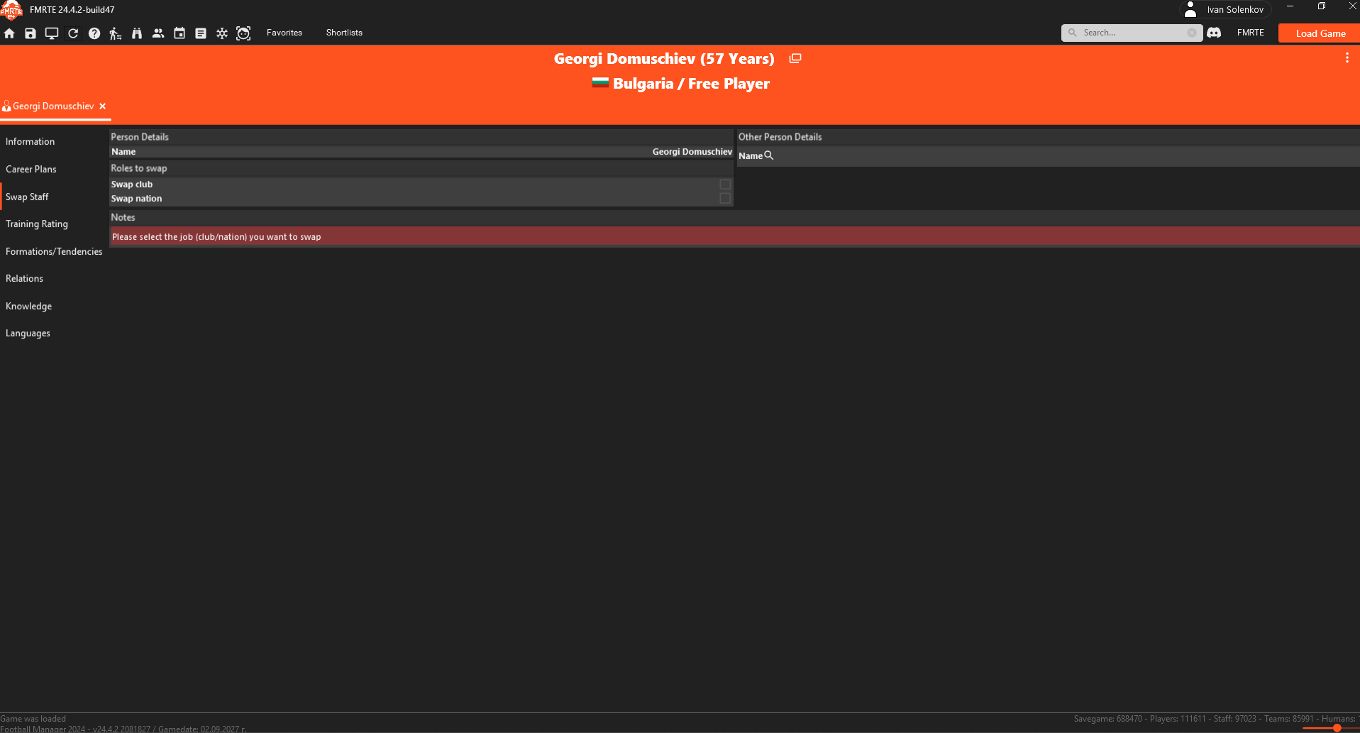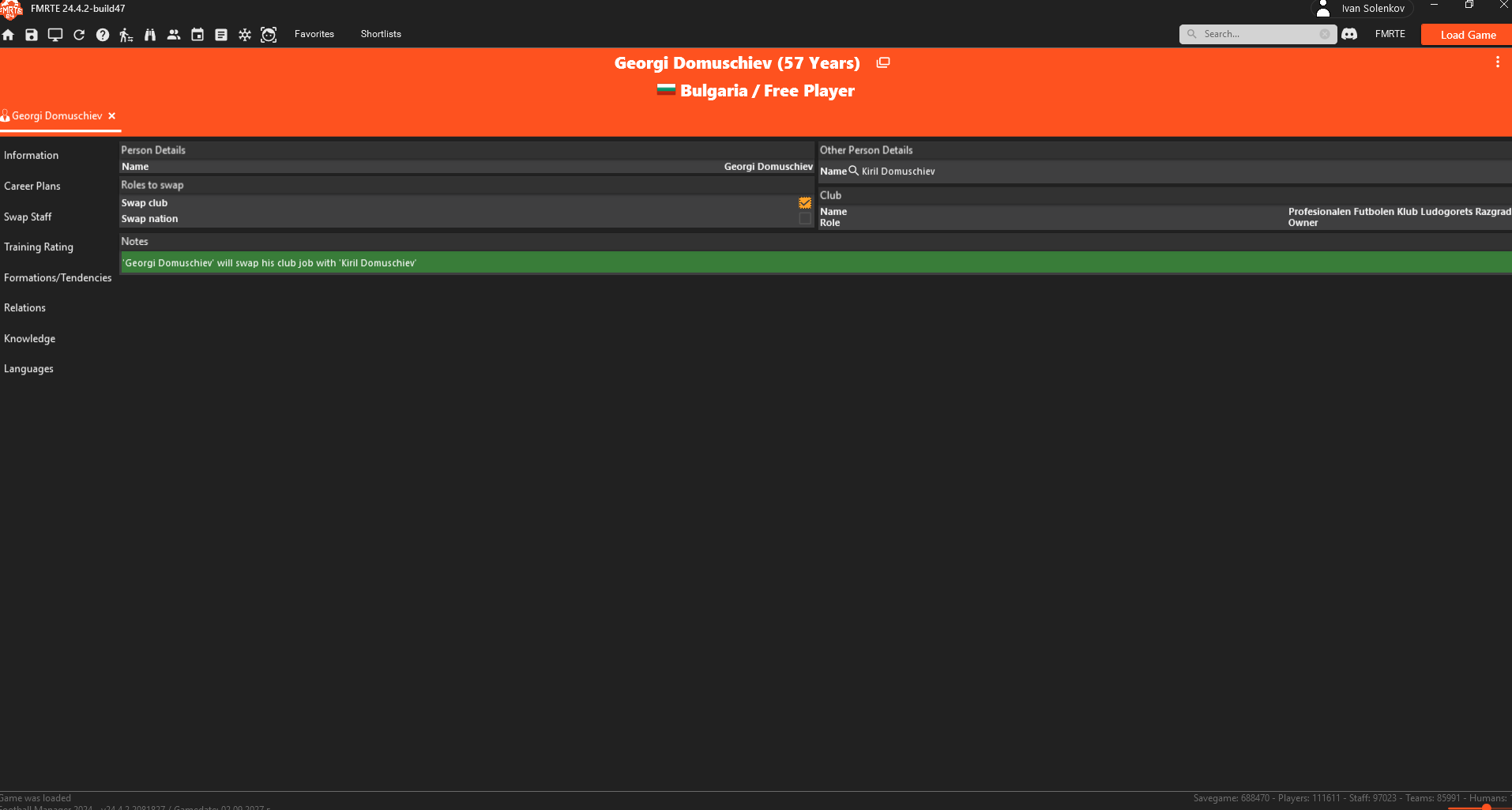 Hello! I think there is bug with Swap Staff. I want to swap Georgi Domuschiev (Free Player) with Kiril Domuschiev (Ludogorets Owner) and it says: 'Georgi Domuschiev' will swap his club job with 'Kiril Domuschiev'. But on the game nothing is happening. Also when I click on Reload button, it's reseting, but they are not swapping. Is there a button to submit and confim this swap? Because I can't see any buttons for confirmation. Or there is another way. Sorry if this is already asked somewhere in the Forum. I'm new. Also thank you in advance!