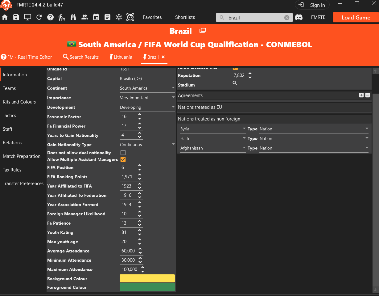 Hi, a few small queries which I am sure have been answered in the past so apologies. Looking at editing nations, the scale is puzzling me. For example, youth rating of a nation goes up to 255/255? And yet when I look at Brazil their rating is only 81/255. Germany is 98/255. I thought youth ratings went up to 200, then Brazil would be around 160, Germany 150 etc. I can't wrap my head around the scale. I am doing a build a nation on FM24 in Lithuania but also want to win International tournaments with them later into the save. I don't want to mess up the balance of the save by not understanding the scale. Likewise youth facilities, recruitment , training etc all go up to 127/127. Again, I thought these only went up to 20. Some clarity on the scaling of these issues would be hugely appreciated by me. Cheers.