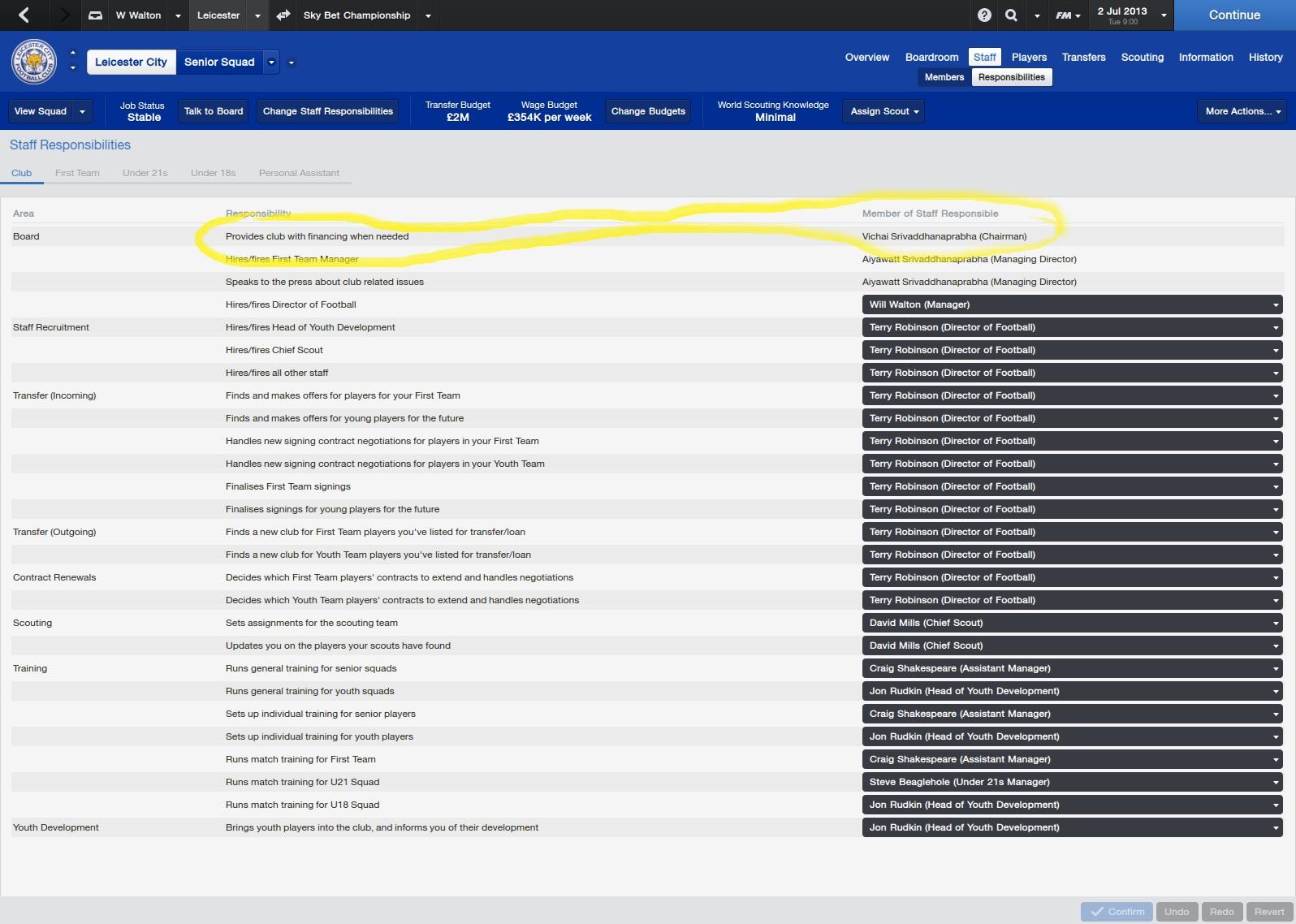 2 - In my save, I have an issue editing a staff responsibility. Obviously, I am able to edit most staff responsibilities myself, within the game, but I am keen to edit one of the BOARD responsibilities. The board responsibility, has the section: 'Provides club with financing when needed' attributed to the Chairman, and I want it to be the owner as I know that he has greater resource. Does the FMRTE allow me to edit this board responsibility and change the individual person to somebody else?