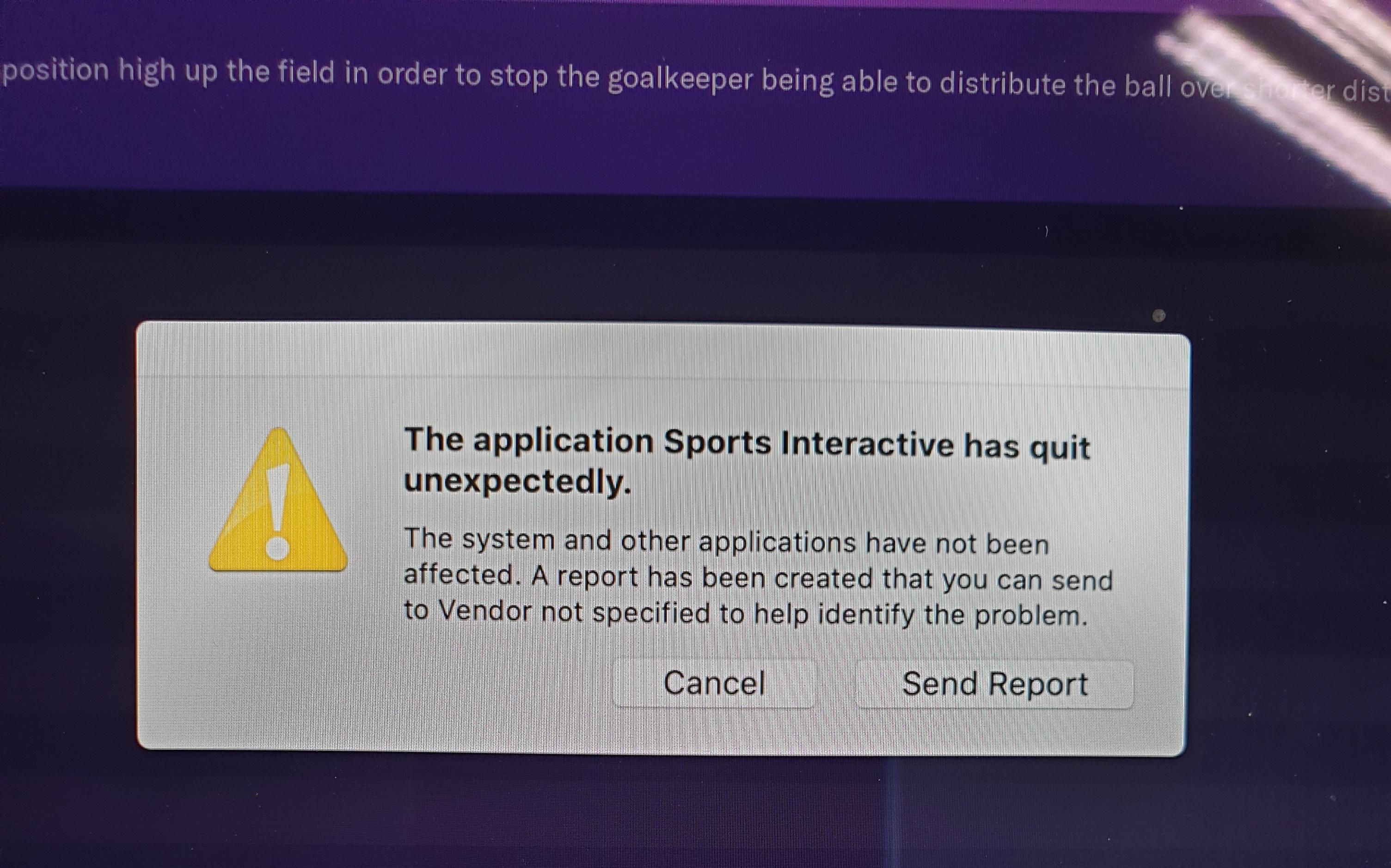 After editing the player using FMRTE 20, every time when i click "save" in the game, it pops up this "the application Sports interactive has quit unexpectedly".  I'm using macOS 10.14.6 version.