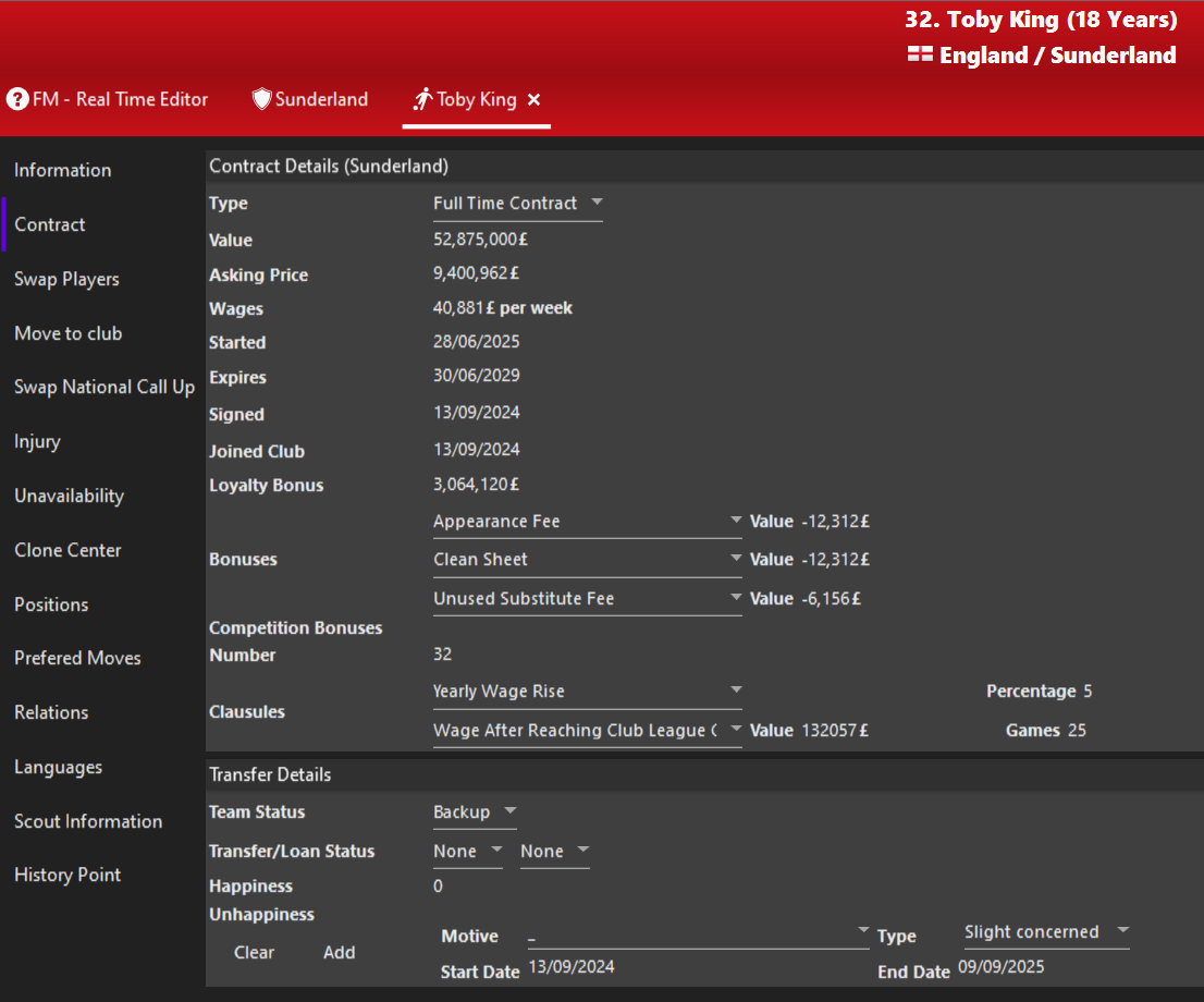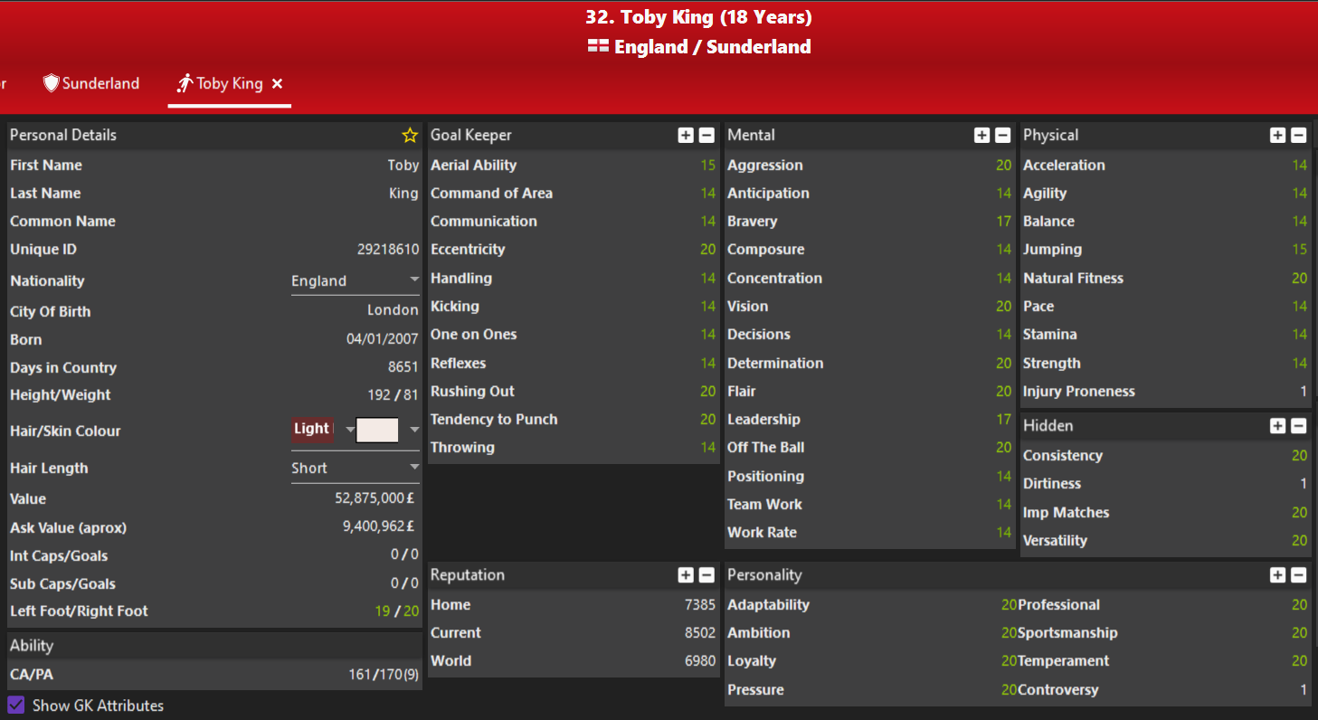 I have noticed that the player layout of FMRTE 20 no longer alignes completely with the player reports in the game.  The discrepancies are best illustrated by comparing the two attached screen prints for a player called Toby King.  A close examination of Goalkeeping, Mental, Physical and technical paramaters illustrates this point.  There is also an issue with Player Happiness where in the game it is very good but FMRTE shows it as zero.